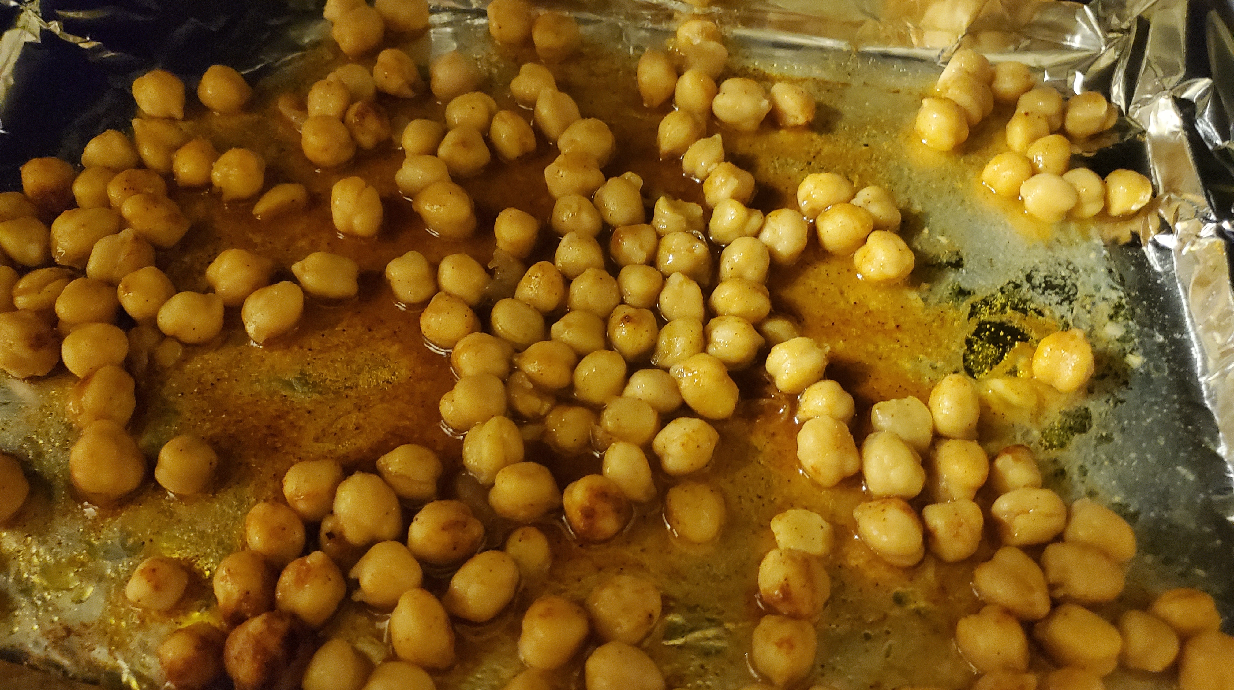 Add the tablespoon of olive then toss gently. Cook in the oven for 10 minutes or until the chickpeas are hot and slightly crispy.