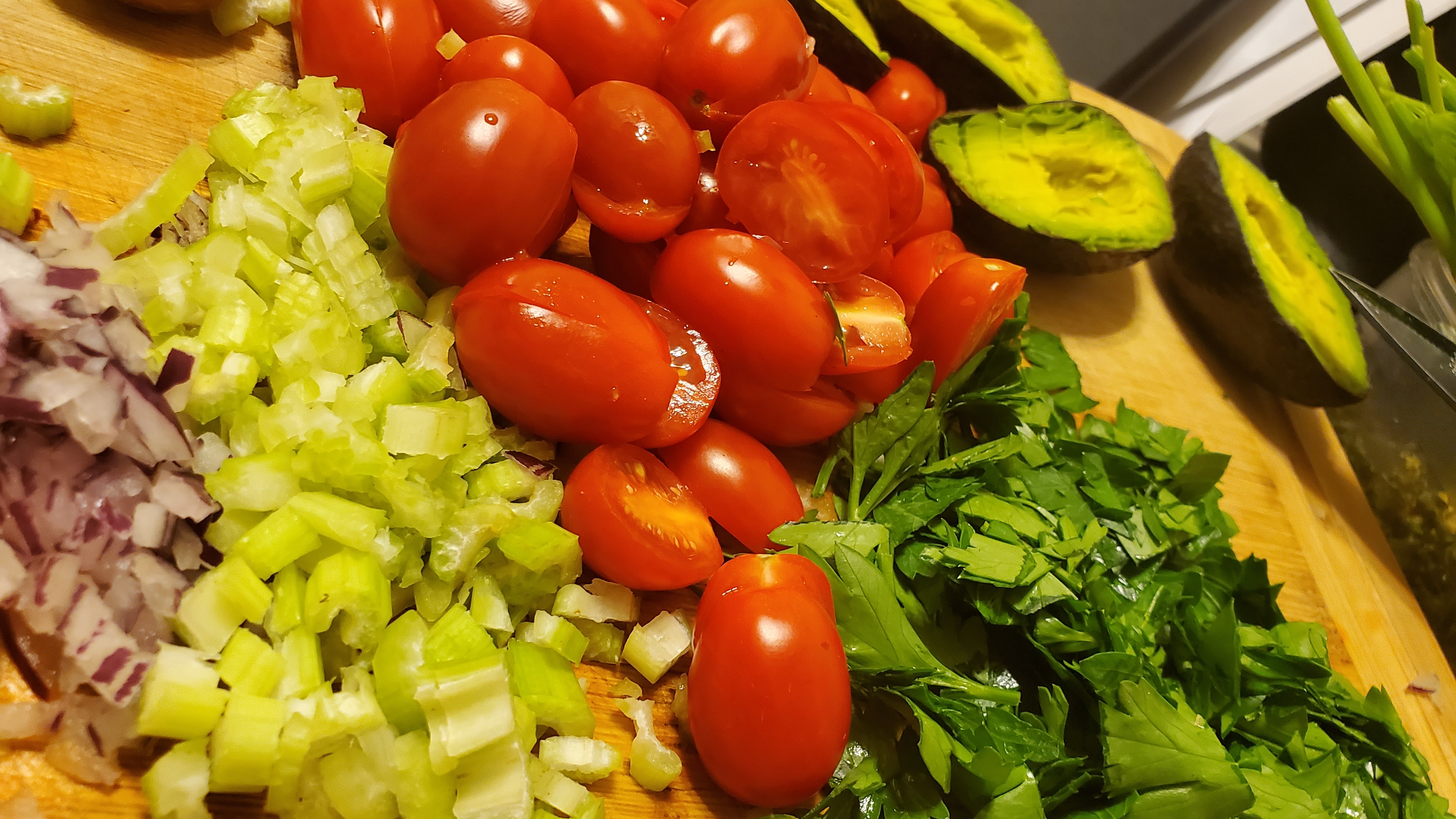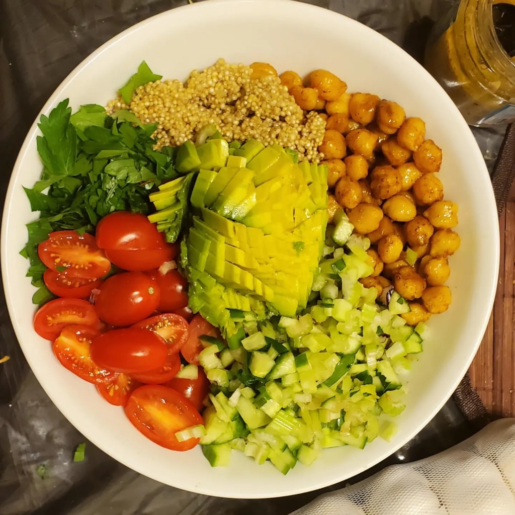 In a large serving bowl add the avocado, quinoa, celery, tomatoes, cucumber, chickpeas and chopped parsley. Toss gently.