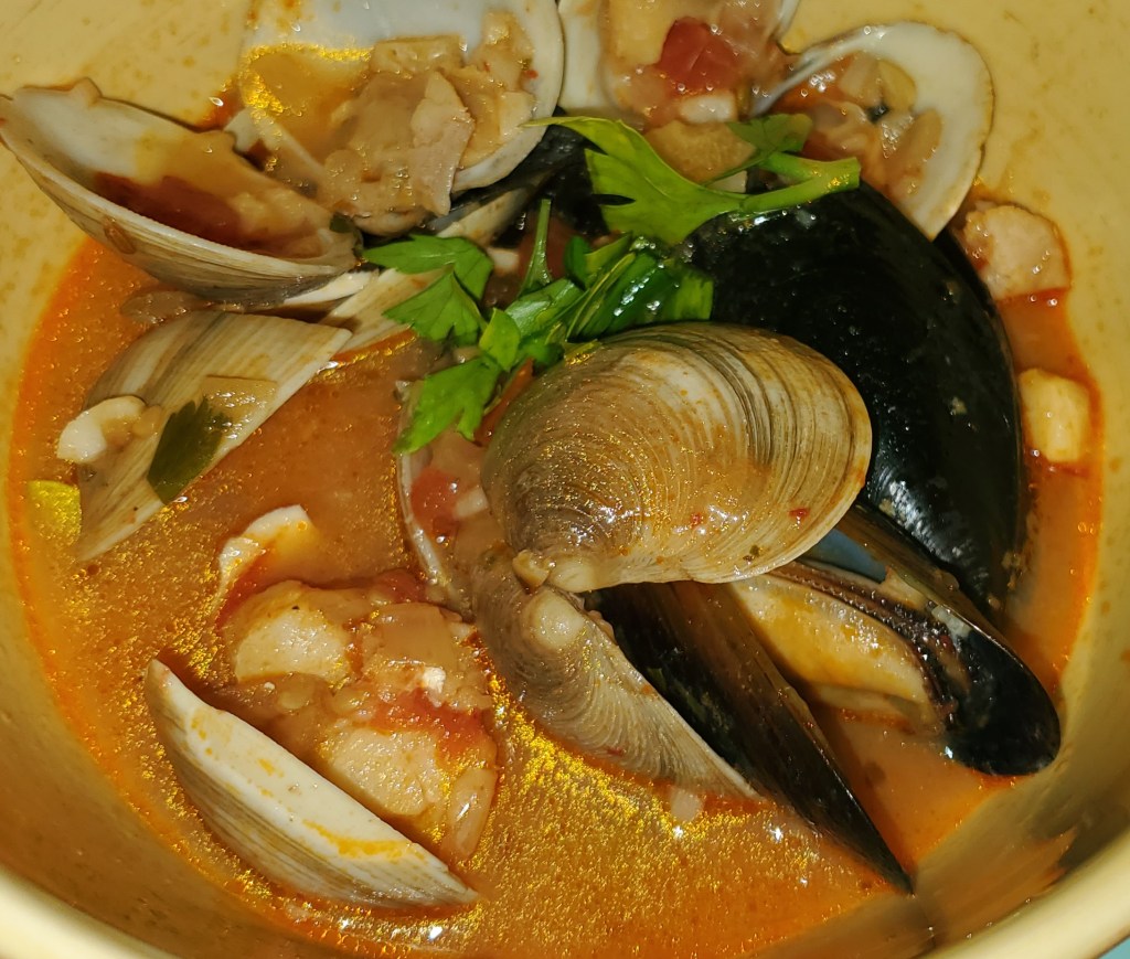 Add the clams and mussels, cover and cook for an additional 5 minutes, then add the shrimp and white fish and cook an additional 5 minutes or until clams and mussels have opened.