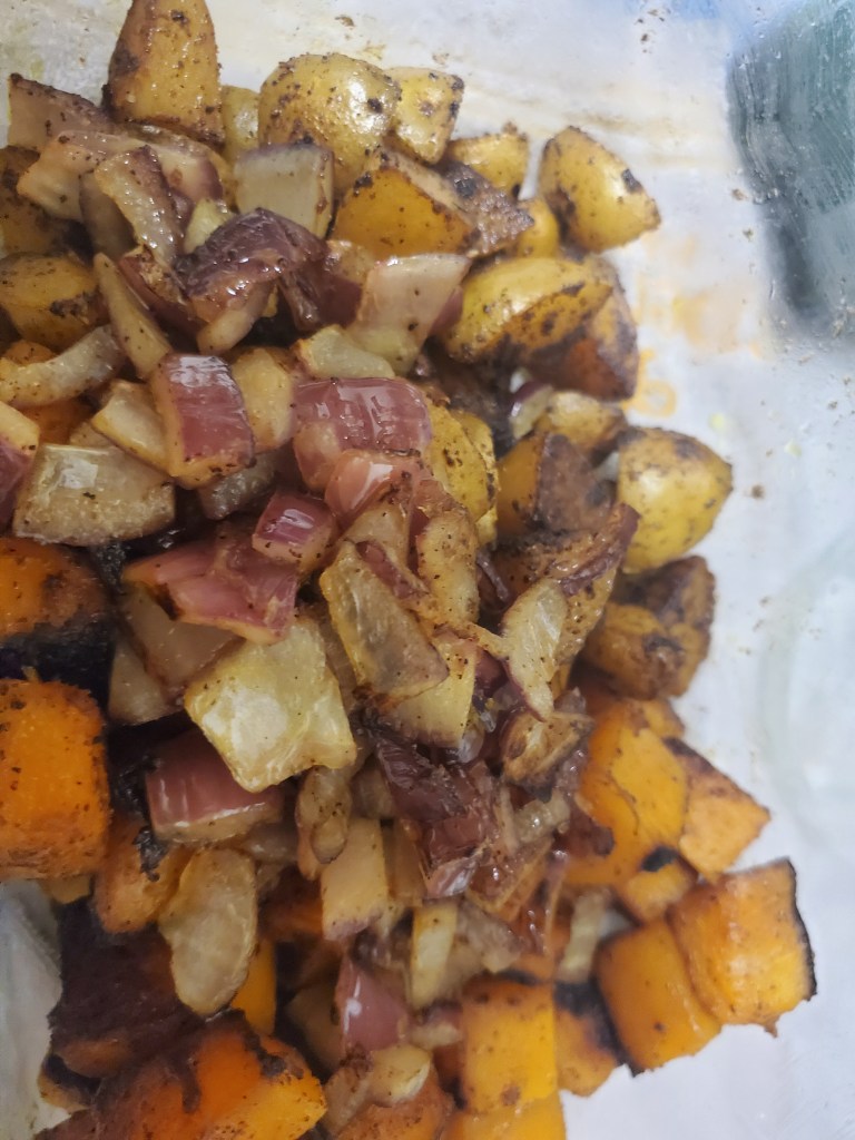 Get out your roasted sweet potatoes, squash and chickpeas, and add the sautéed onion on top