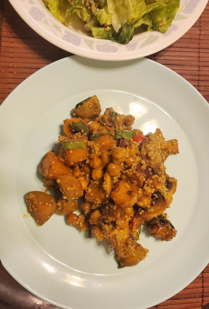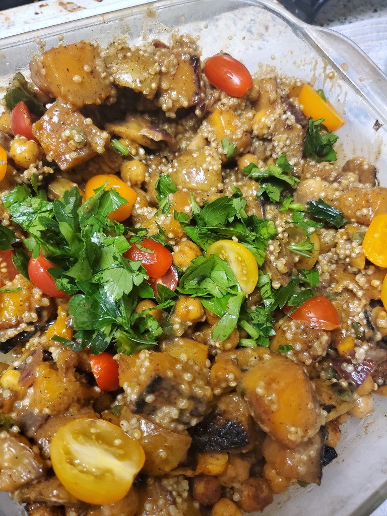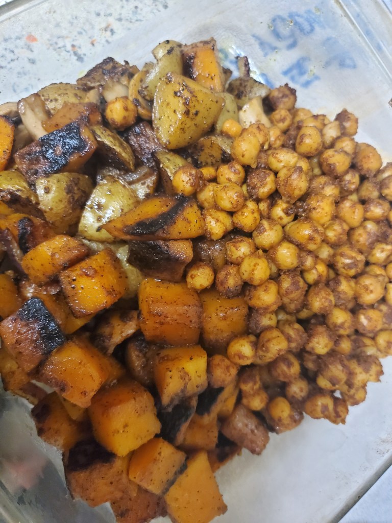 Add your butternut squash, and sweet potato around the chickpeas even if not cooked all the way, because we are gonna finish then in the oven! One all on the pan roast in the oven at 400° F for 15 minutes, check, turn oven down to 375 °F and roast for another 10 min.