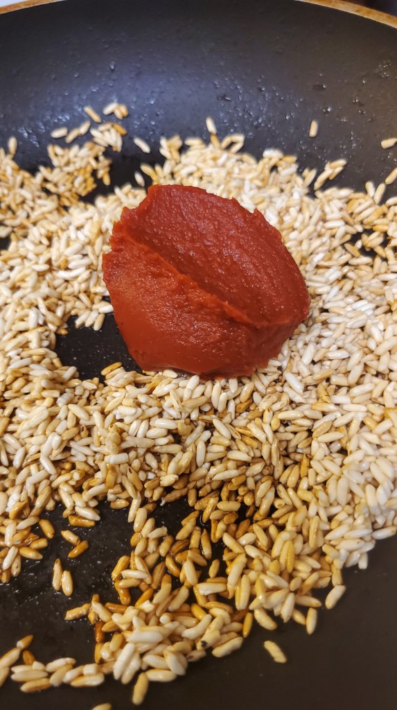 • Add the tomato paste to the rice and mix in well like in the video above and photos below.
