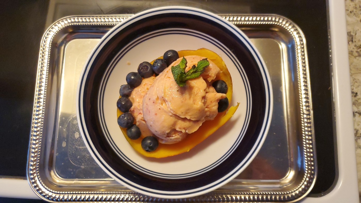 Get out your frozen mango skins, place in a bowl, scoop your Nice Cream into them, add fresh blueberries (optional) add, a sprig of mint too if you’d like (optional).