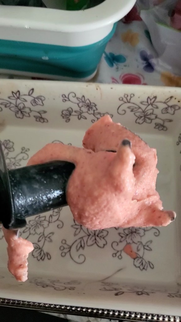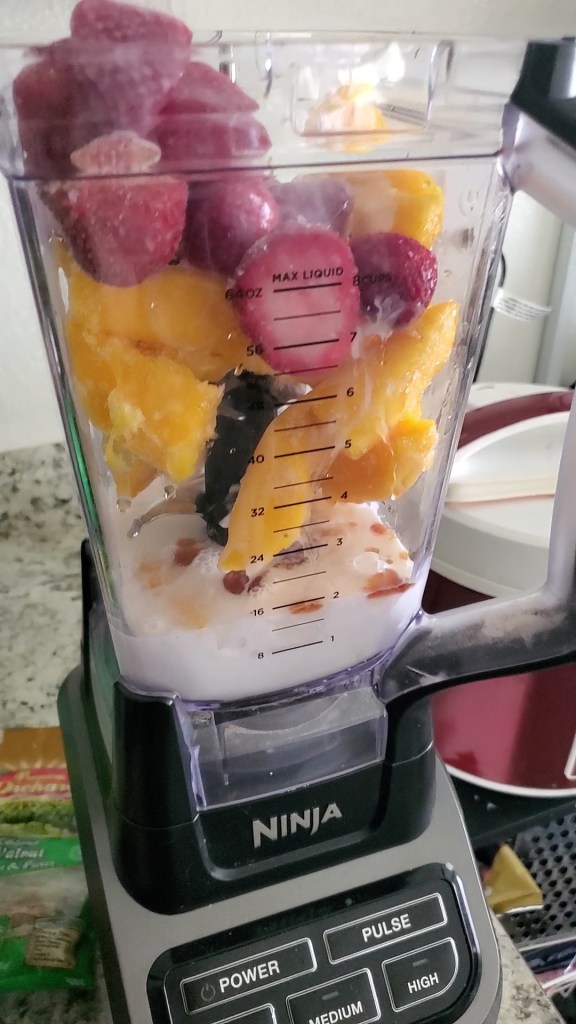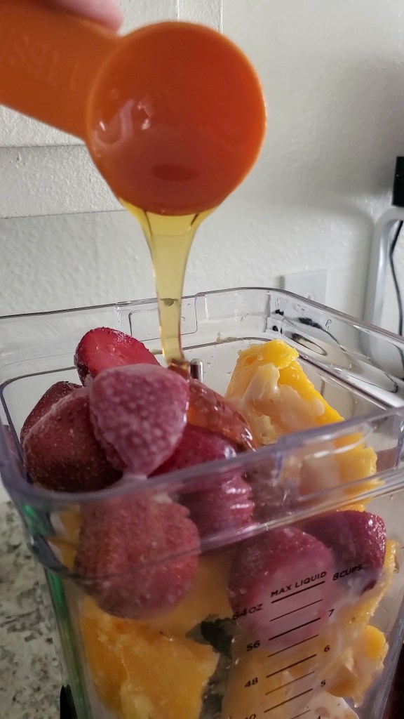 I realized I didn’t have enough mangos, so I substituted strawberries for 1 cup and mango on the other cup, equal split. 😋 It was divine to say the least. So, I am gonna share the recipe the way I made it, and if you want just mango like the original recipe, I’m sure it’s amazing too, I haven’t been able to try it yet.
